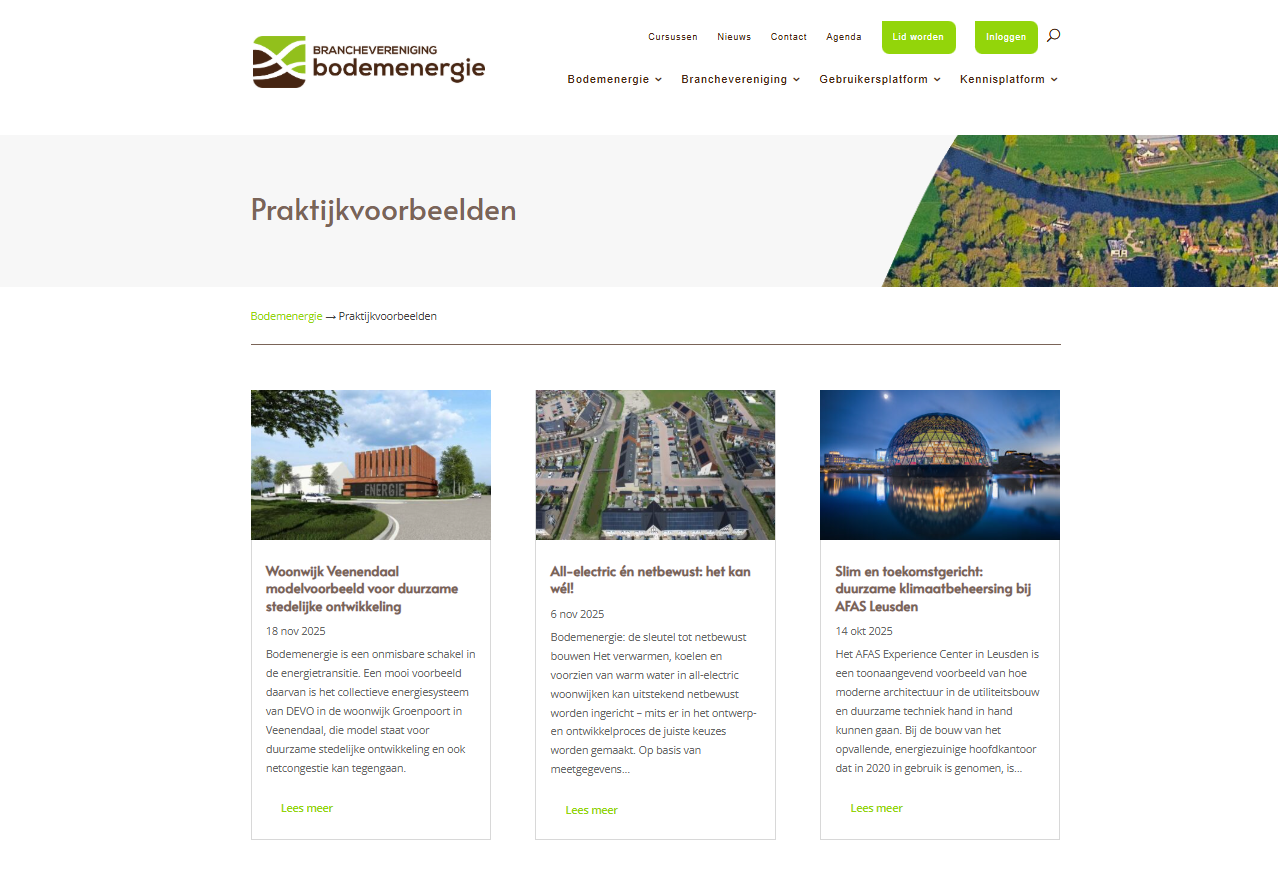 Bodemenergie is in veel situaties een duurzame en toekomstbestendige oplossing. Maar hoe ziet dat er in de praktijk uit? Om gemeenten, beleidsmakers en adviseurs beter te ondersteunen bij het verkennen en onderbouwen van de toepassing van bodemenergie, hebben wij een nieuwe pagina toegevoegd aan onze website: Praktijkvoorbeelden.